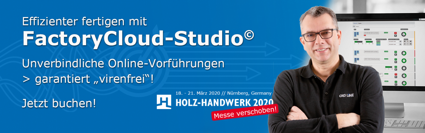 Unter diesem Schwerpunktthema wollten wir FactoryCloud-Studio© erstmalig auf der HOLZ-HANDWERK in Nürnberg präsentieren. Leider muss das nun richtigerweise noch etwas warten. Erleben Sie unsere neue cloudbasierte Software für die zentrale Produktionssteuerung und Lagerverwaltung sowie alle weiteren Neuheiten bis dahin einfach online.