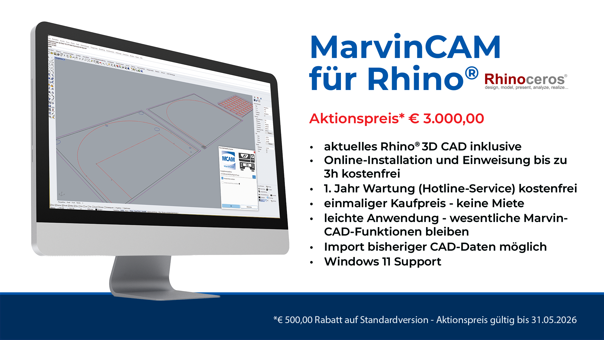 "MarvinCAM für Rhino" ist unsere neue Applikation zur 3D CAD-Software Rhinoceros®. Es umfasst alle wesentlichen Funktionen vom bewährten MarvinCAD. Da wir Support und Lauffähigkeit auf Windows 11 nur für unsere aktuellen Programme garantieren können, haben wir für alle Kunden (MarvinCAD/MarvinCAD|complete) und Interessenten unser Einsteiger- bzw. Wechselangebot noch einmal bis 31.05.2026 verlängert.