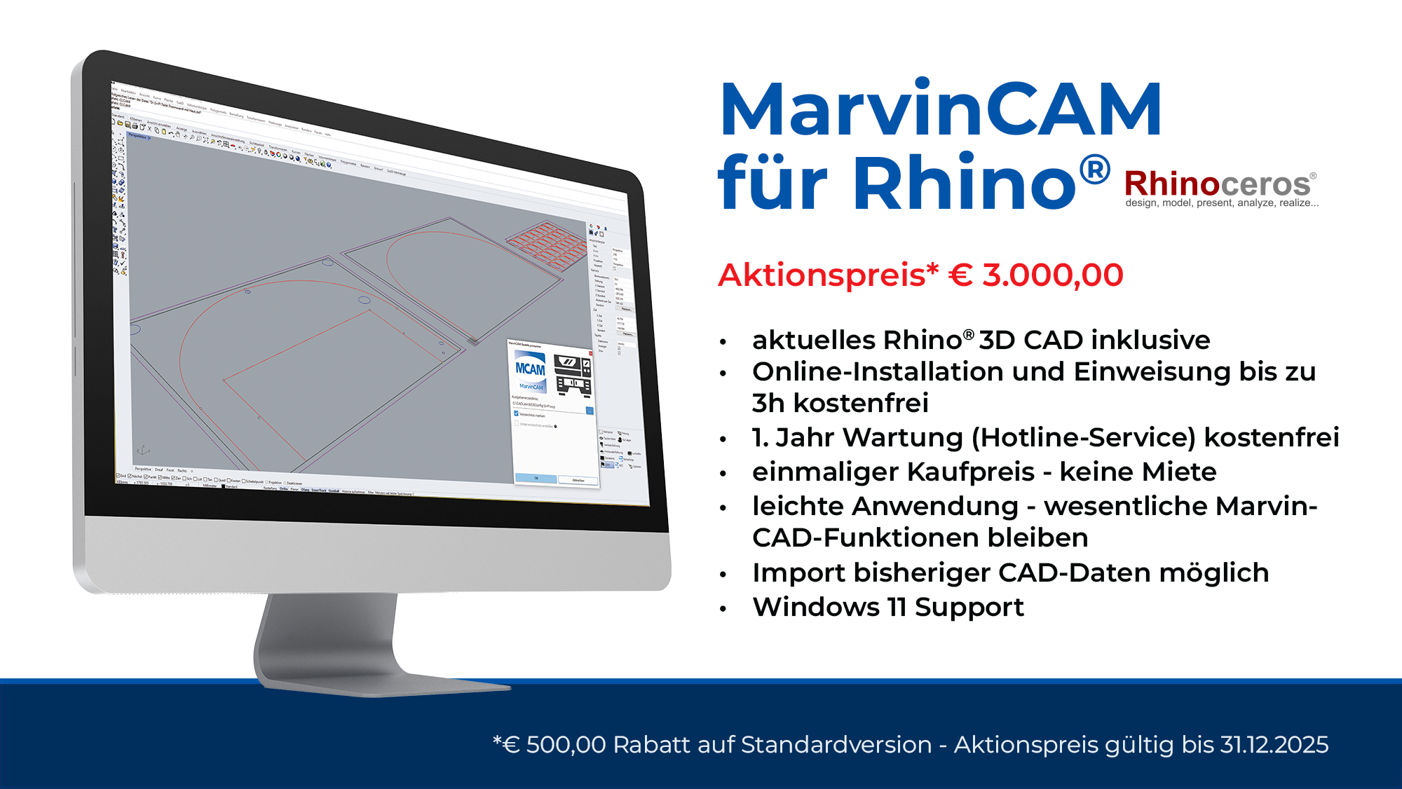 "MarvinCAM für Rhino" ist unsere neue Applikation zur 3D CAD-Software Rhinoceros®. Es umfasst alle wesentlichen Funktionen vom bewährten MarvinCAD. Da wir Support und Lauffähigkeit auf Windows 11 nur für unsere aktuellen Programme garantieren können, haben wir für alle MarvinCAD-Kunden ein attraktives Wechselangebot zusammengestellt.